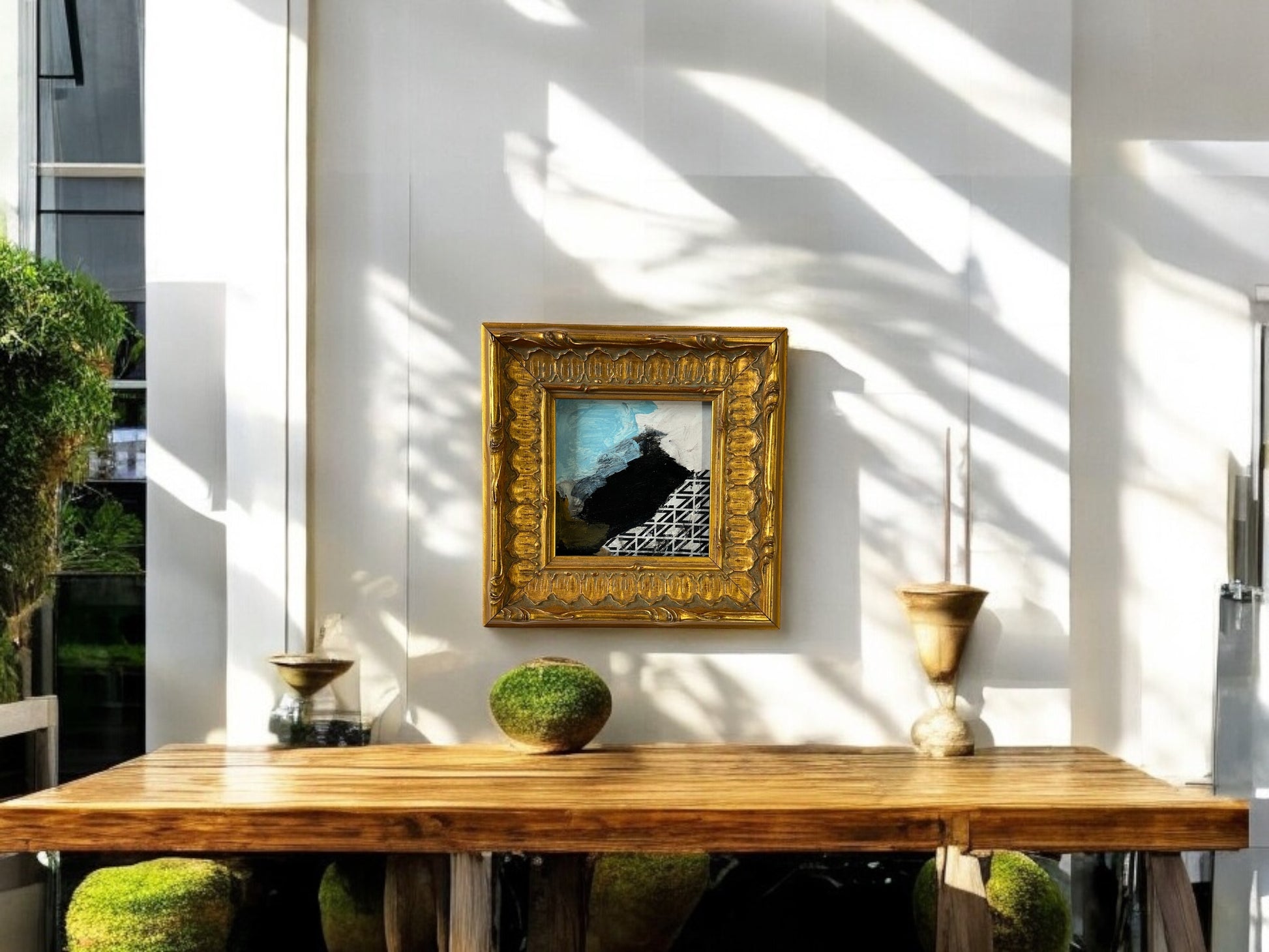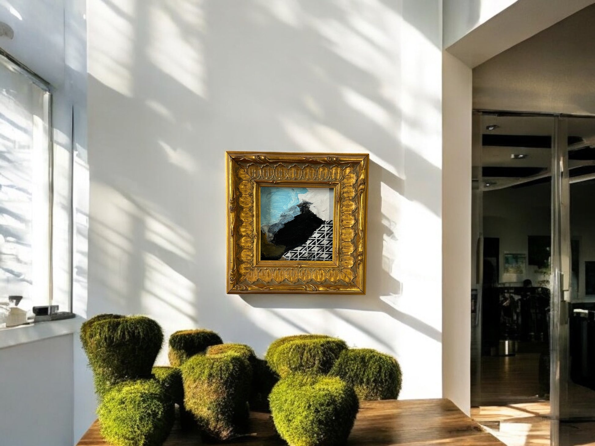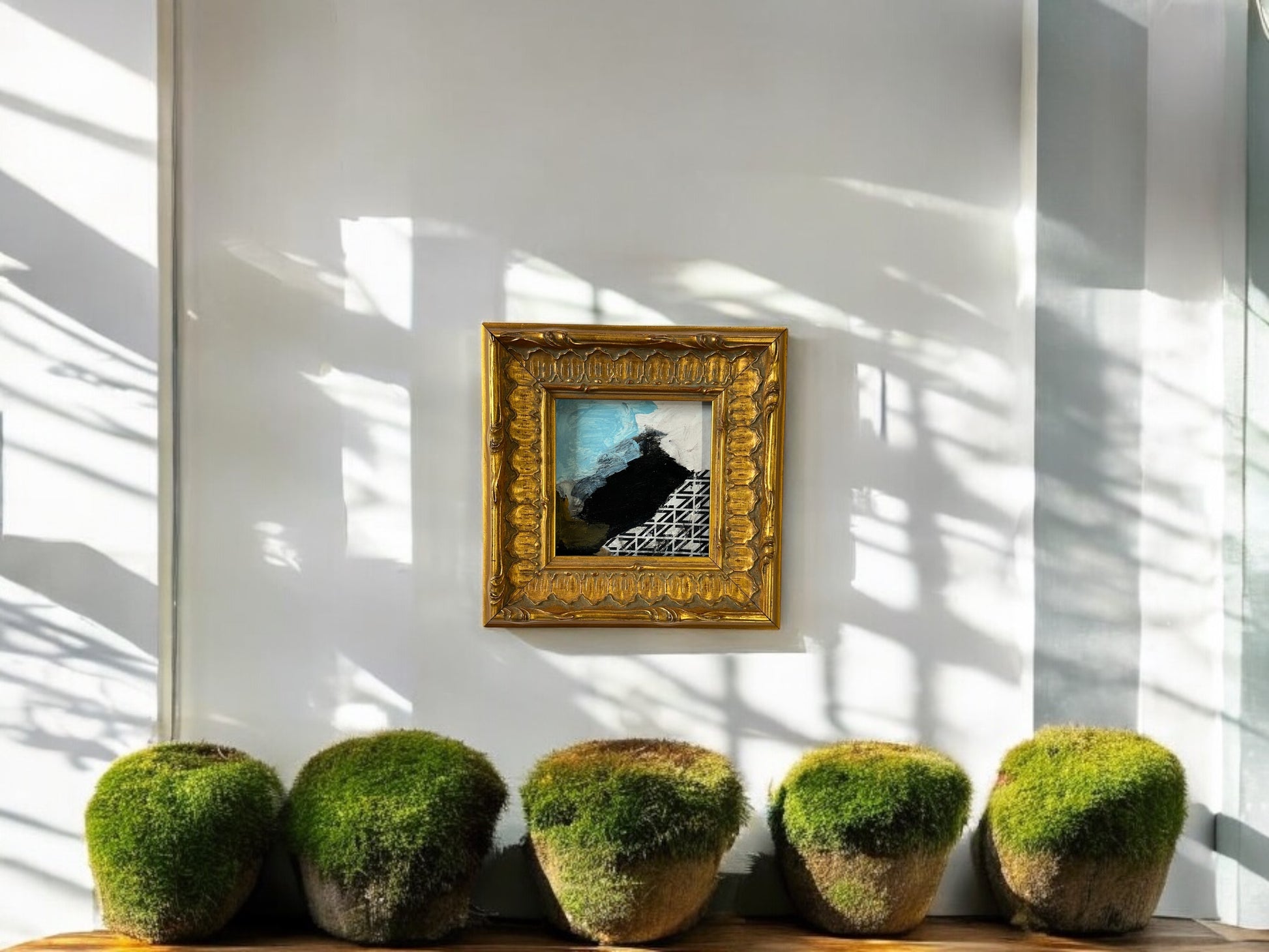 Introducing the Current Trends Series - DVO - #1005. This stunning collage on canvas utilizes mixed media for a unique, dynamic piece of art. The custom hand made gold frame, measuring 8 1/2 x 8 1/2 inches, adds a touch of sophistication. Bring a modern touch to any room with art number 1005.
