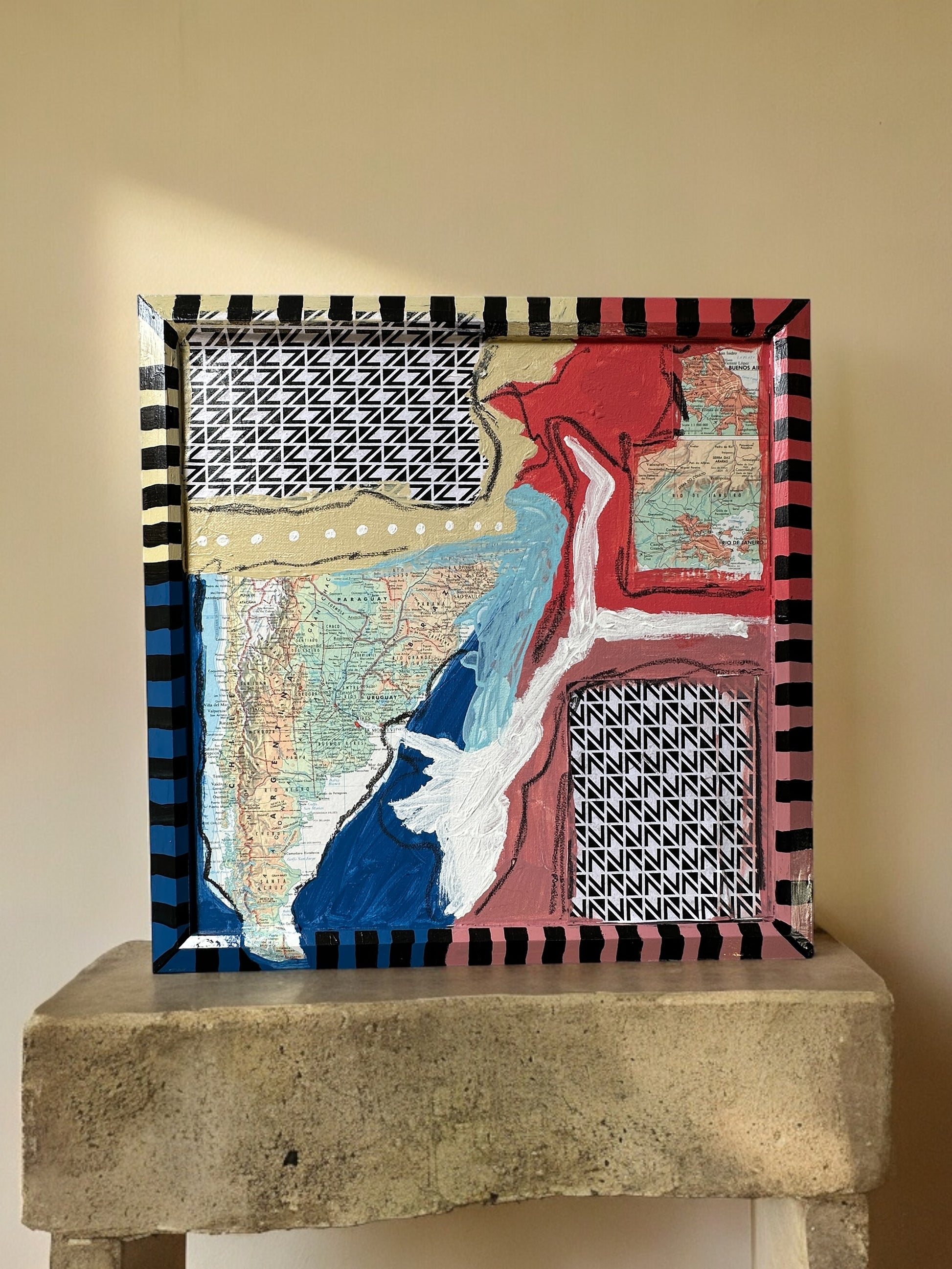 Introducing the Current Trends Series - DVO - #1088. This stunning collage on canvas utilizes mixed media for a unique, dynamic piece of art. The custom hand painted frame, measuring 15 1/2 x 15 1/2 inches, adds a touch of sophistication. Bring a modern touch to any room with art number 1088.