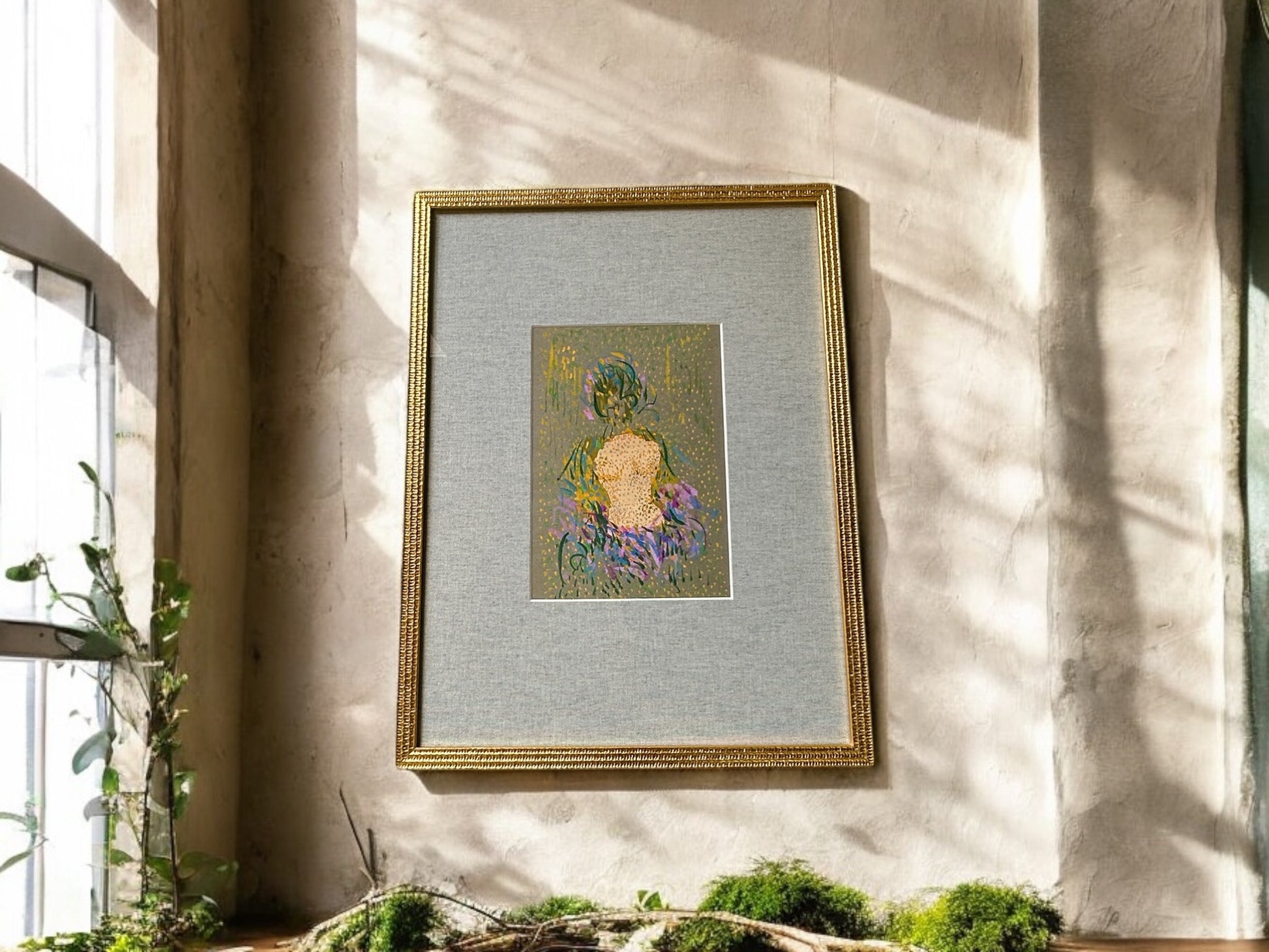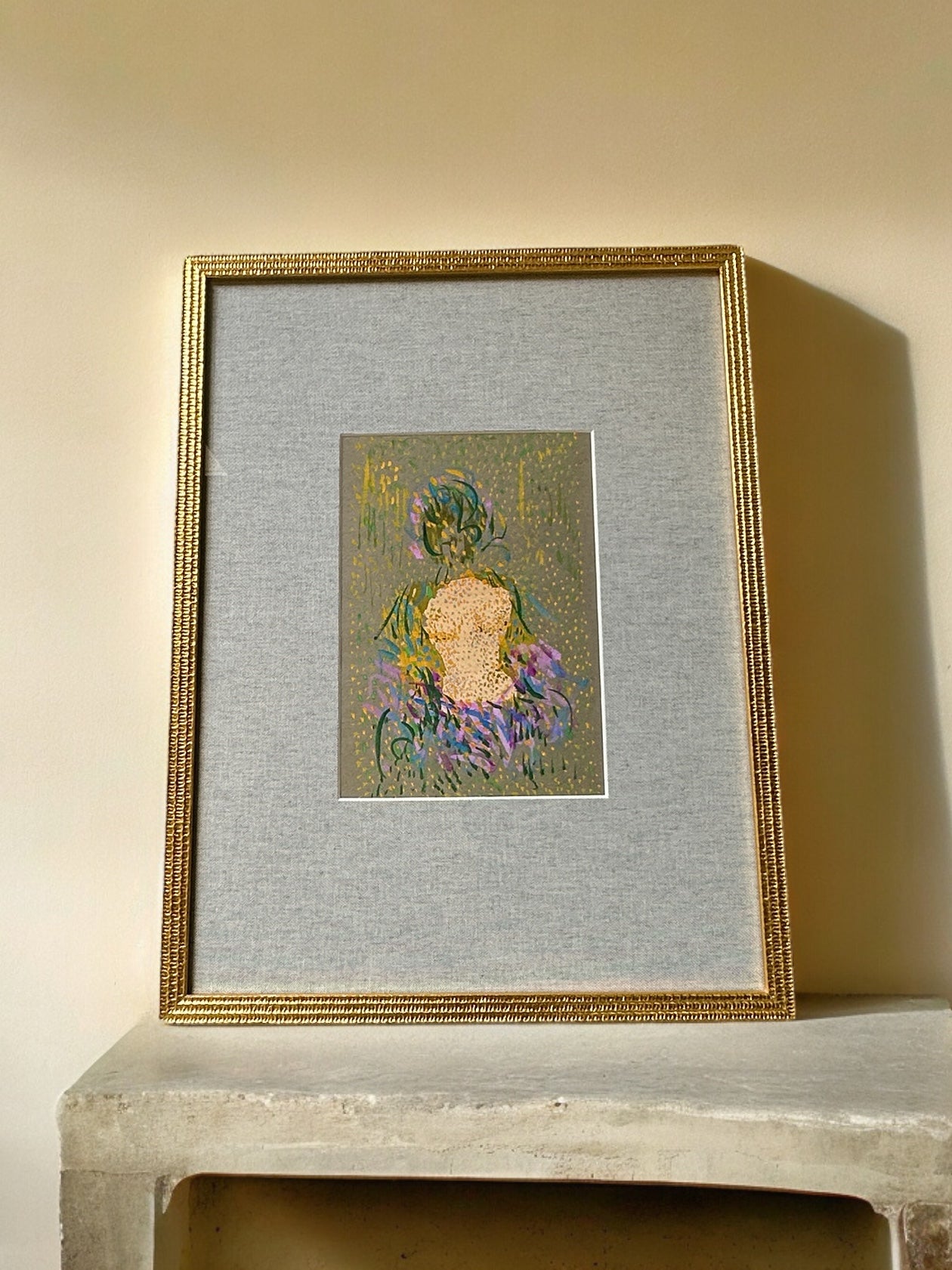 Add a stunning piece of art to your collection with the Faces of Eternity Series - Foss - #1091. This mixed media on paper by Roberta Foss is a one-of-a-kind work of art that will add depth and beauty to any space. Expertly custom framed, it measures 16 x 21”, making it the perfect addition to your home or office.