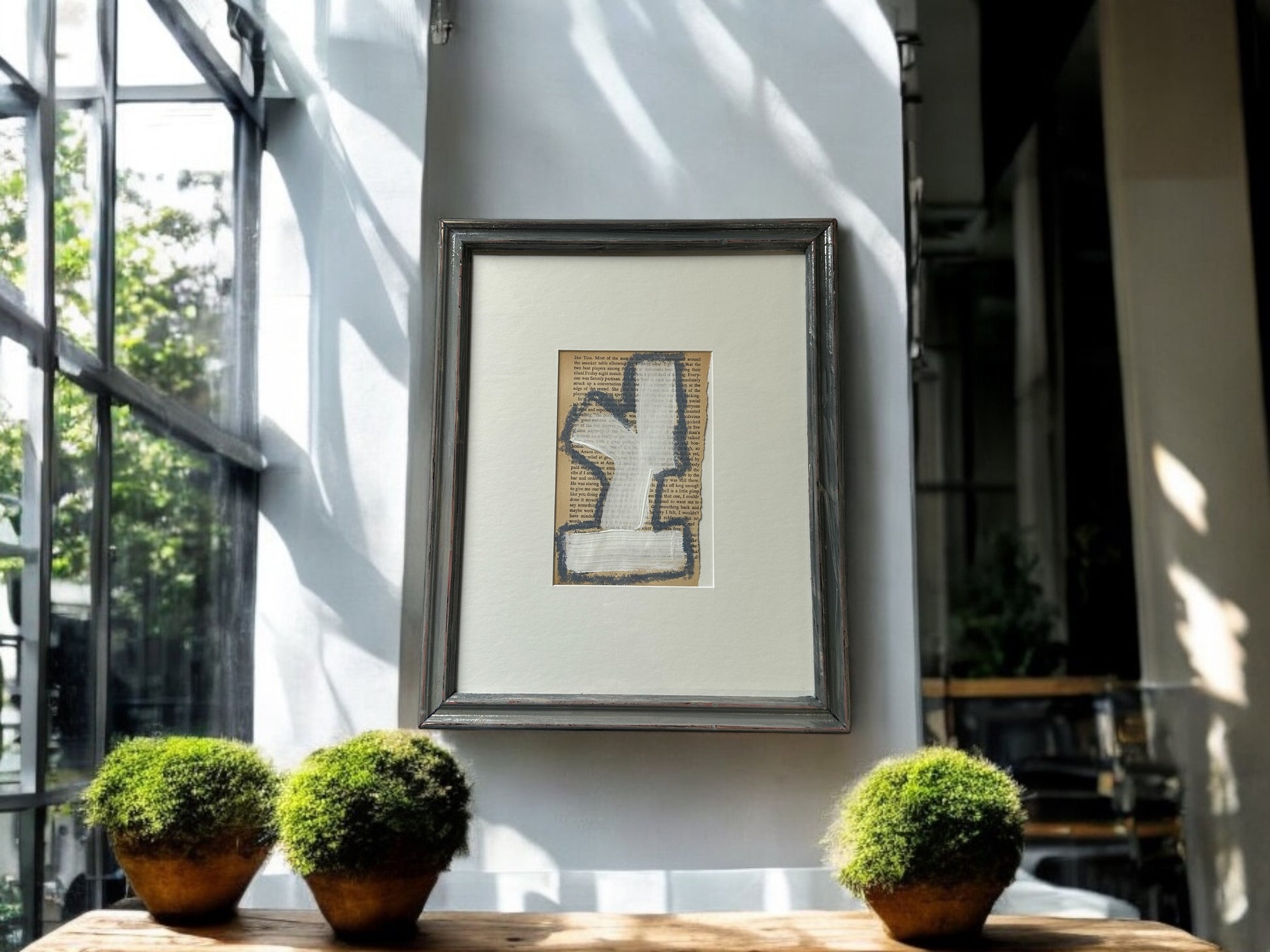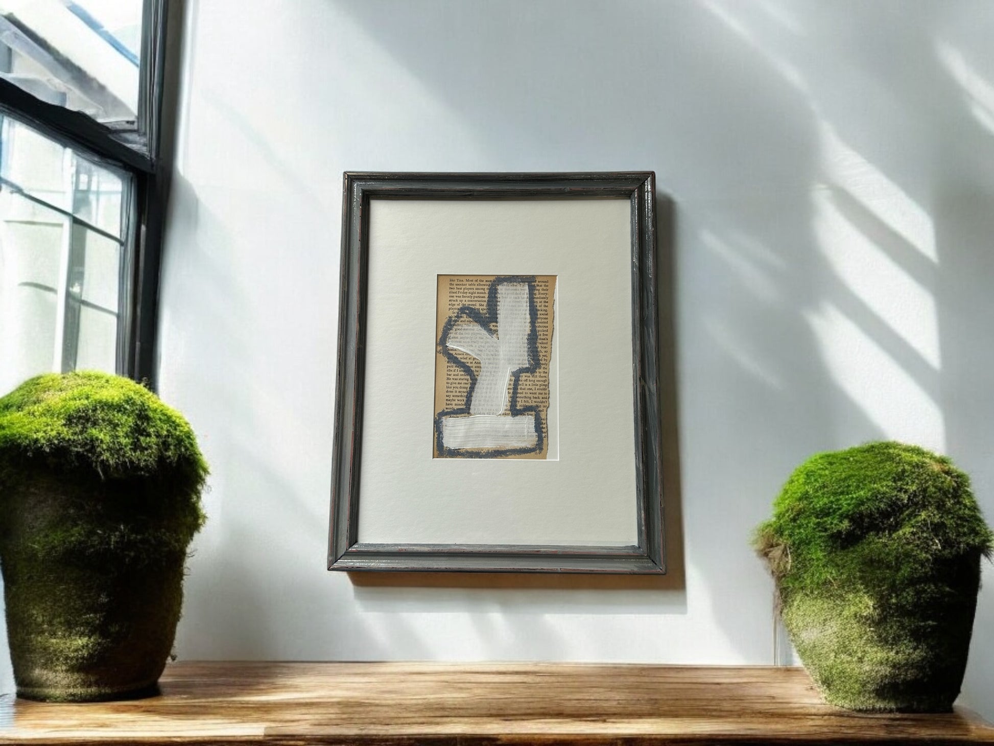 Expertly crafted by DVO, the Collage Mixed Media on vintage book pages #1042 is a unique blend of mixed media on vintage paper, elegantly paired with a custom-made frame. Measuring 12 1/2 x 15 1/2 inches, this stunning piece is a testament to DVO's expertise and creativity. Elevate your home decor with this one-of-a-kind artwork.