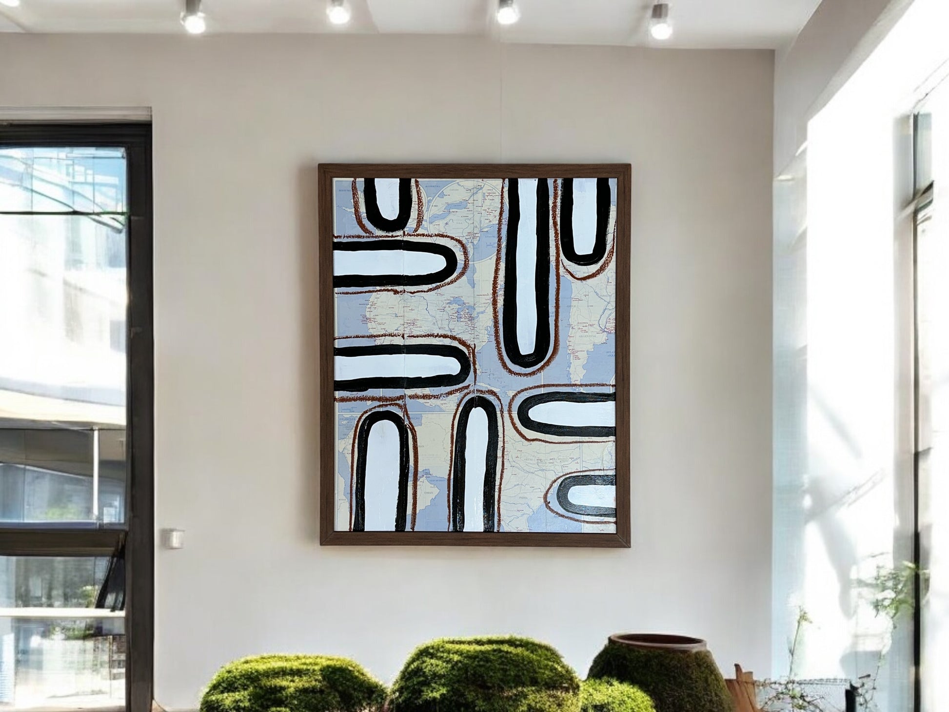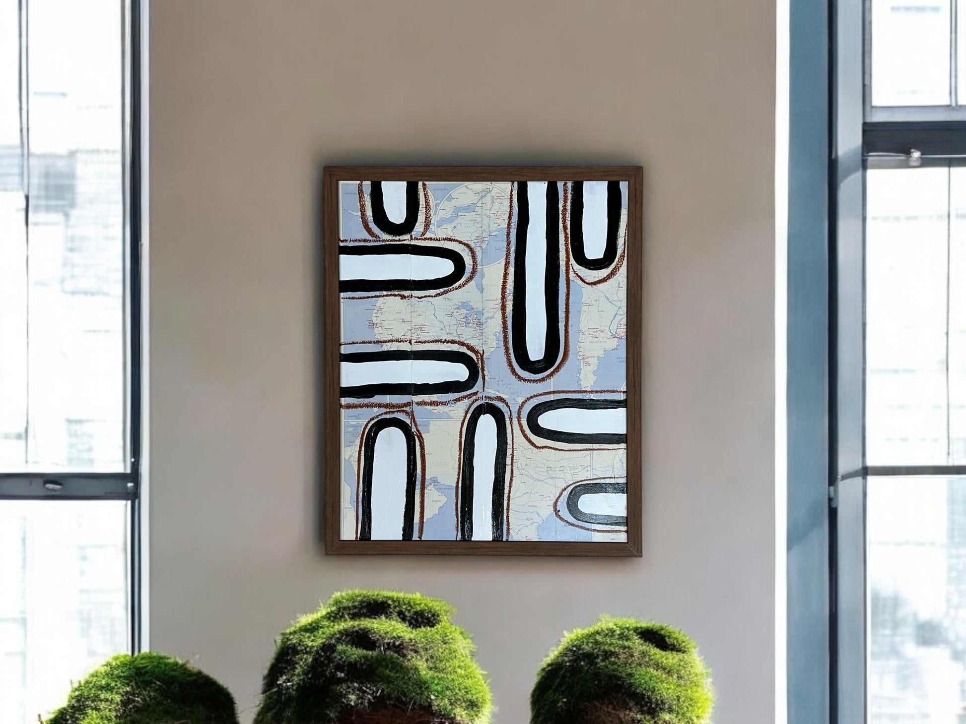 Introducing the Launched Series - DVO - #1045. This stunning collage on canvas utilizes mixed media for a unique, dynamic piece of art. The custom hand mare frame, measuring 17 x 21 inches, adds a touch of sophistication. Bring a modern touch to any room with art number 1045.