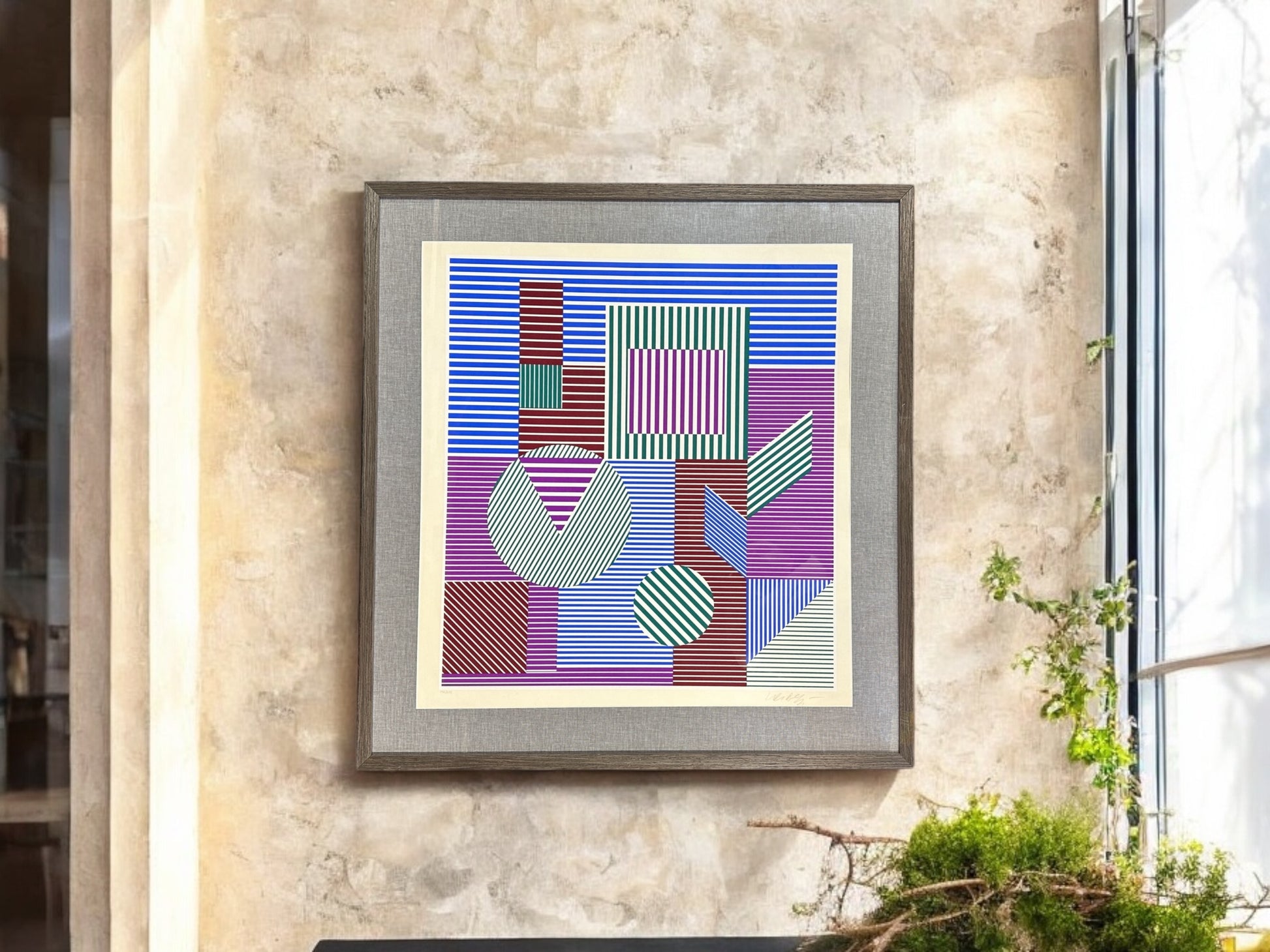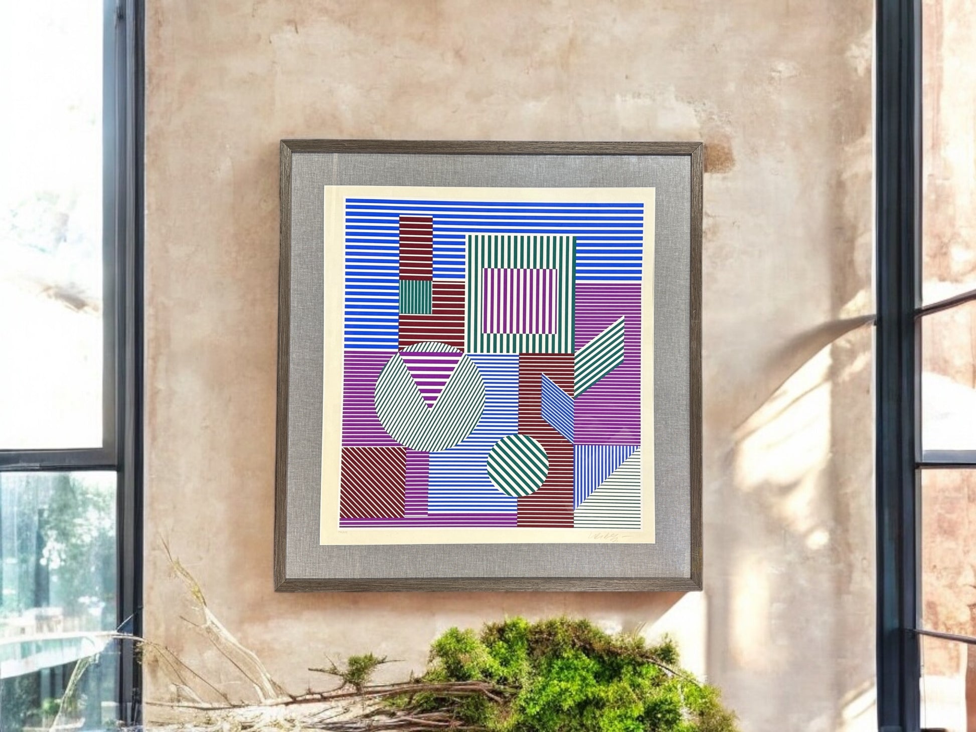 This limited edition screen print, number 1250, features a custom linen mat and wood frame, measuring 33 x 35 inches. Expertly crafted and showcasing the work of renowned artist Victor Vasarely, this piece is a must-have for any art enthusiast. Elevate your space with this unique and timeless addition.