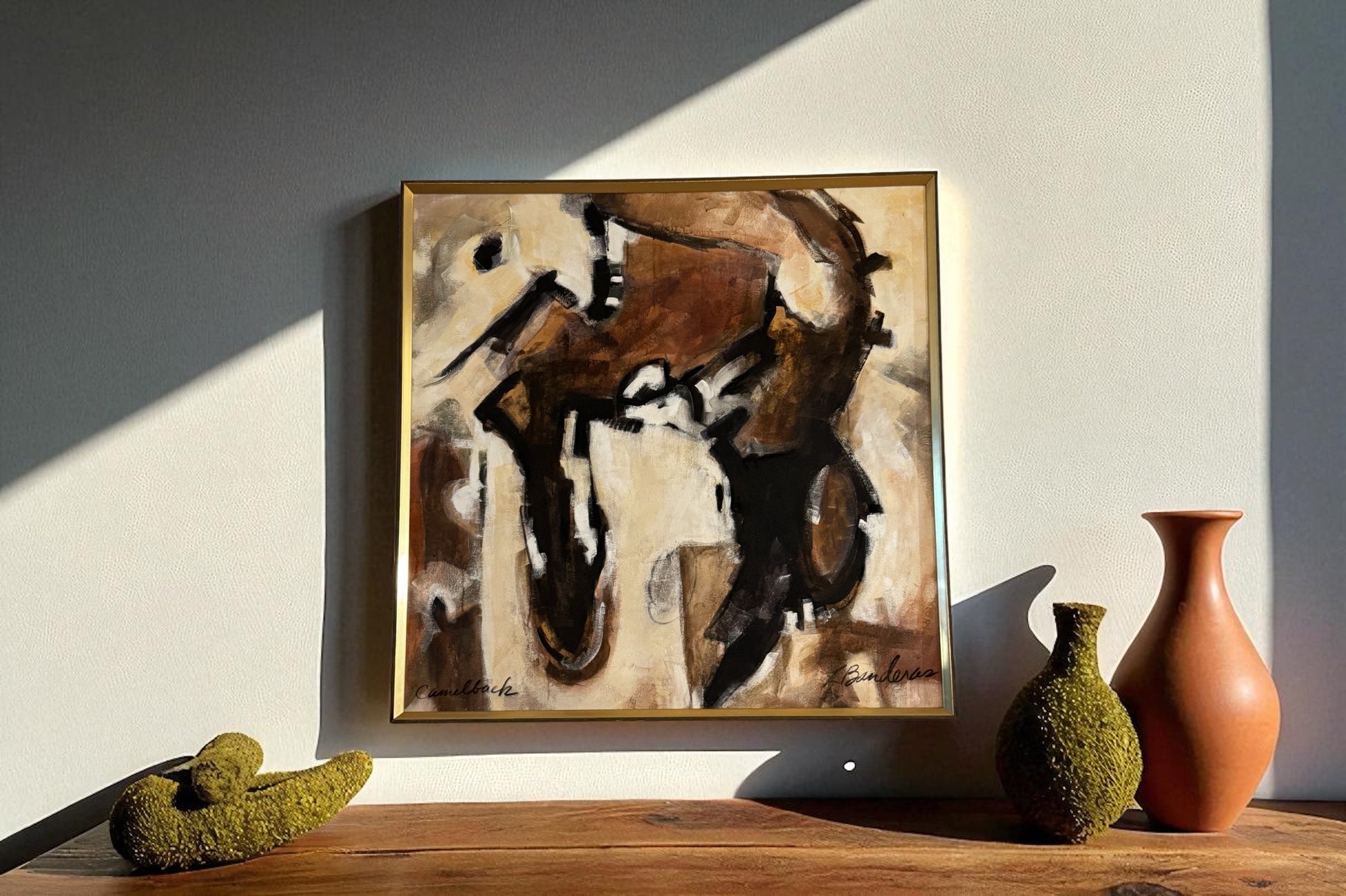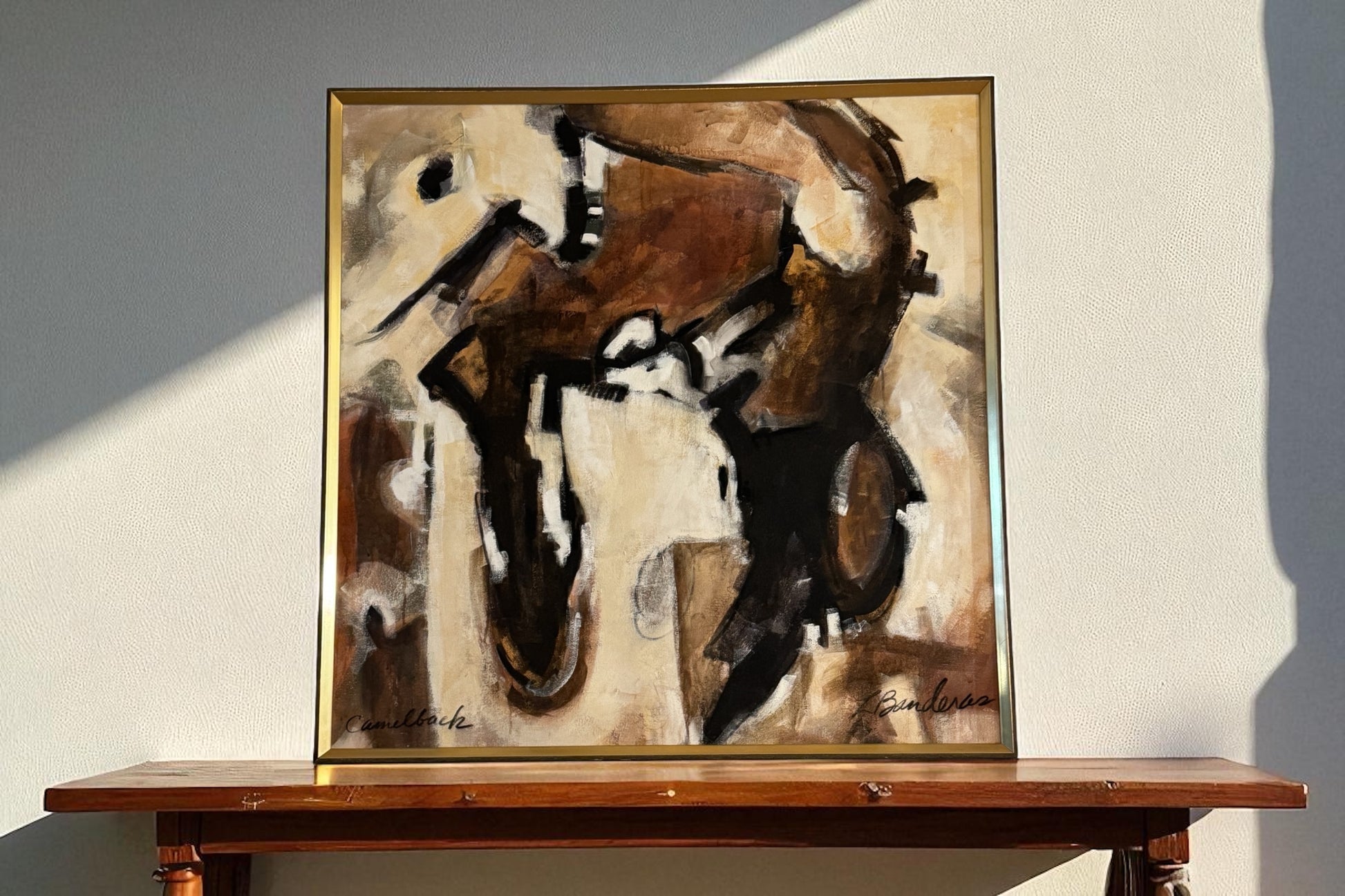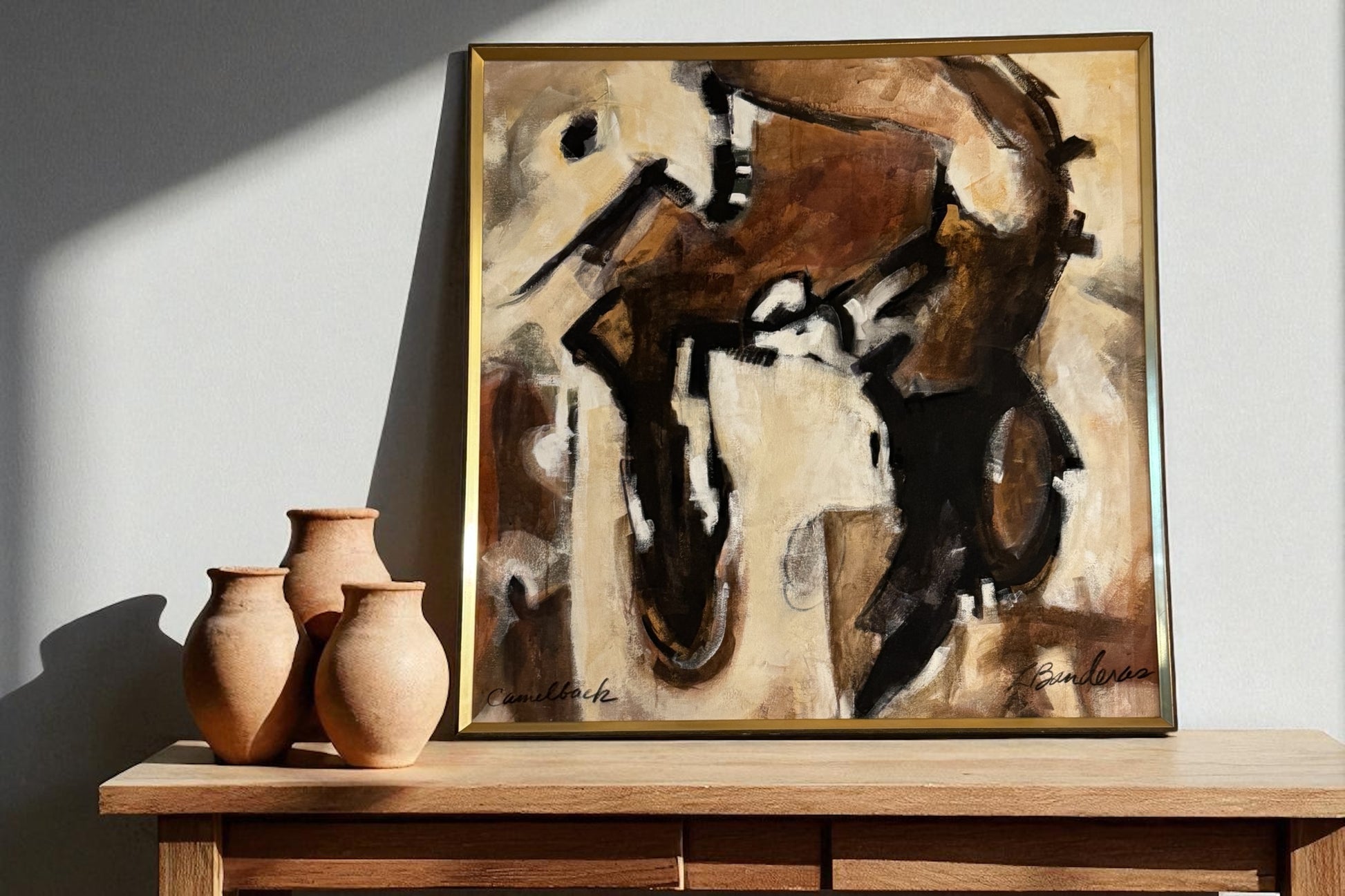 Experience the beauty of Loretta Banderas' oil on canvas masterpiece, "Camelback." Measuring 45 x 45 inches, this piece is elegantly showcased in a custom gold bevel and wire brush wood frame. Add art number 1450 to your collection today.