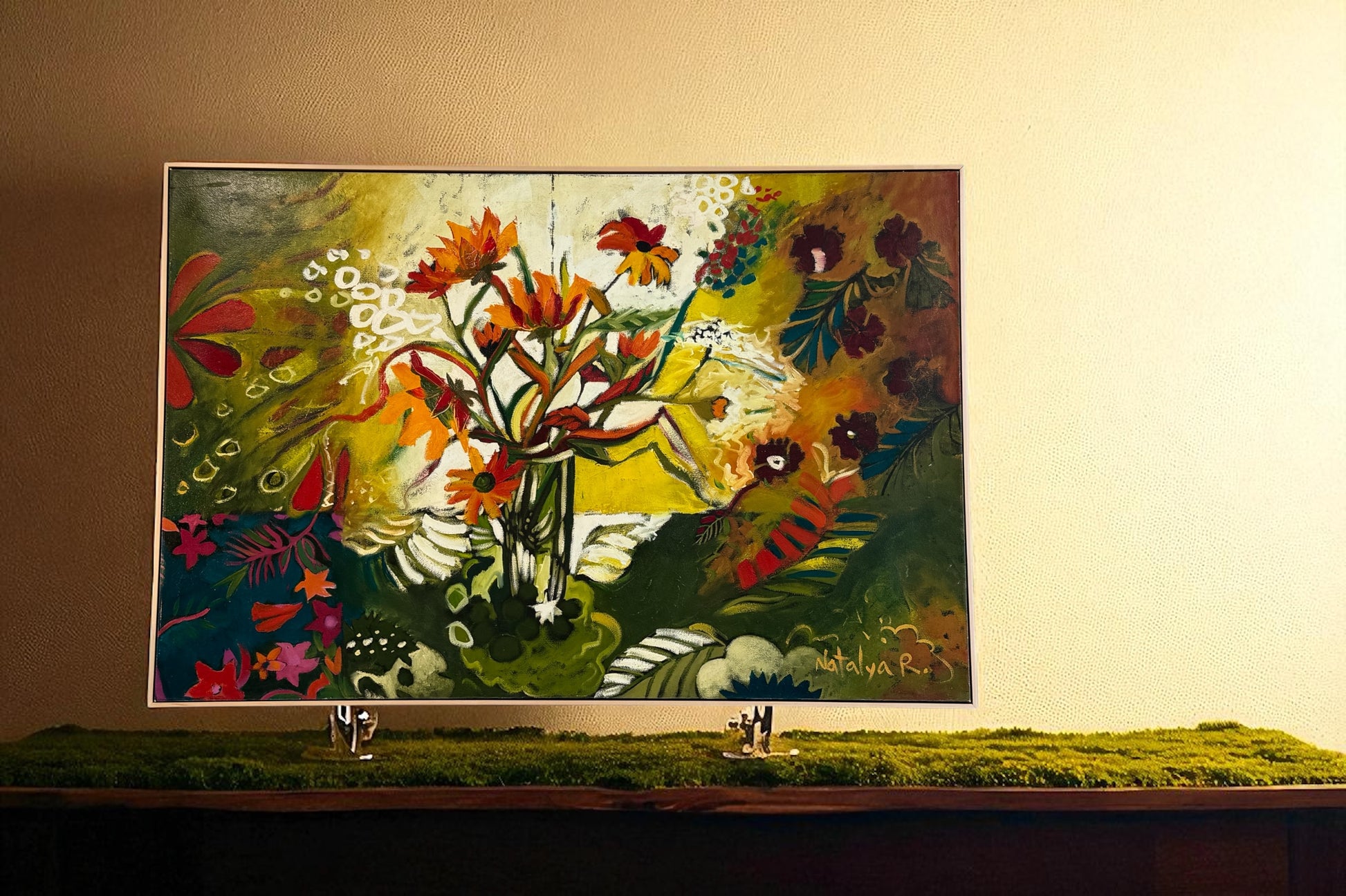 Expertly crafted by Natalya Romanosky, this stunning "Flower Burst" oil painting on canvas (art number 1444) comes beautifully housed in a floater frame measuring 40 x 60". Immerse yourself in nature's beauty with this exquisite piece of art.