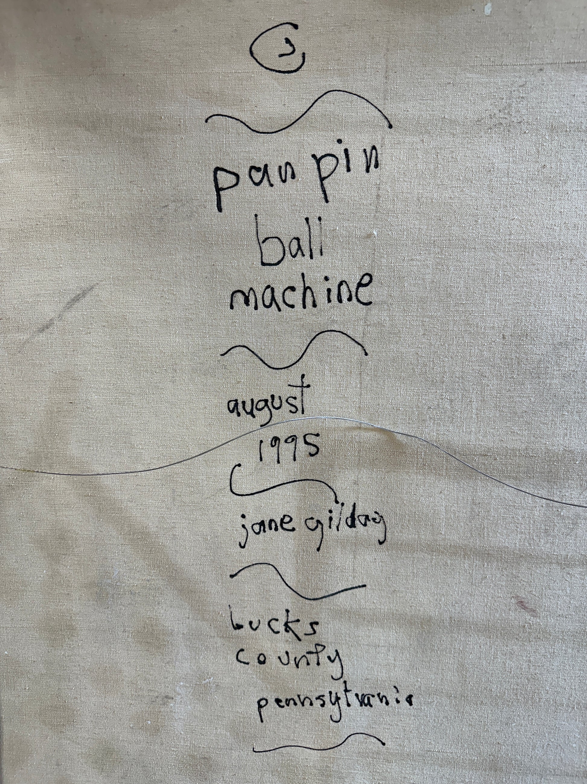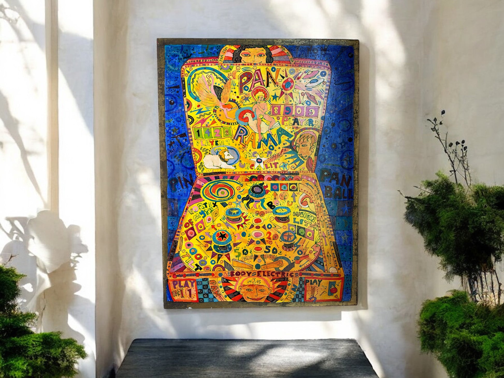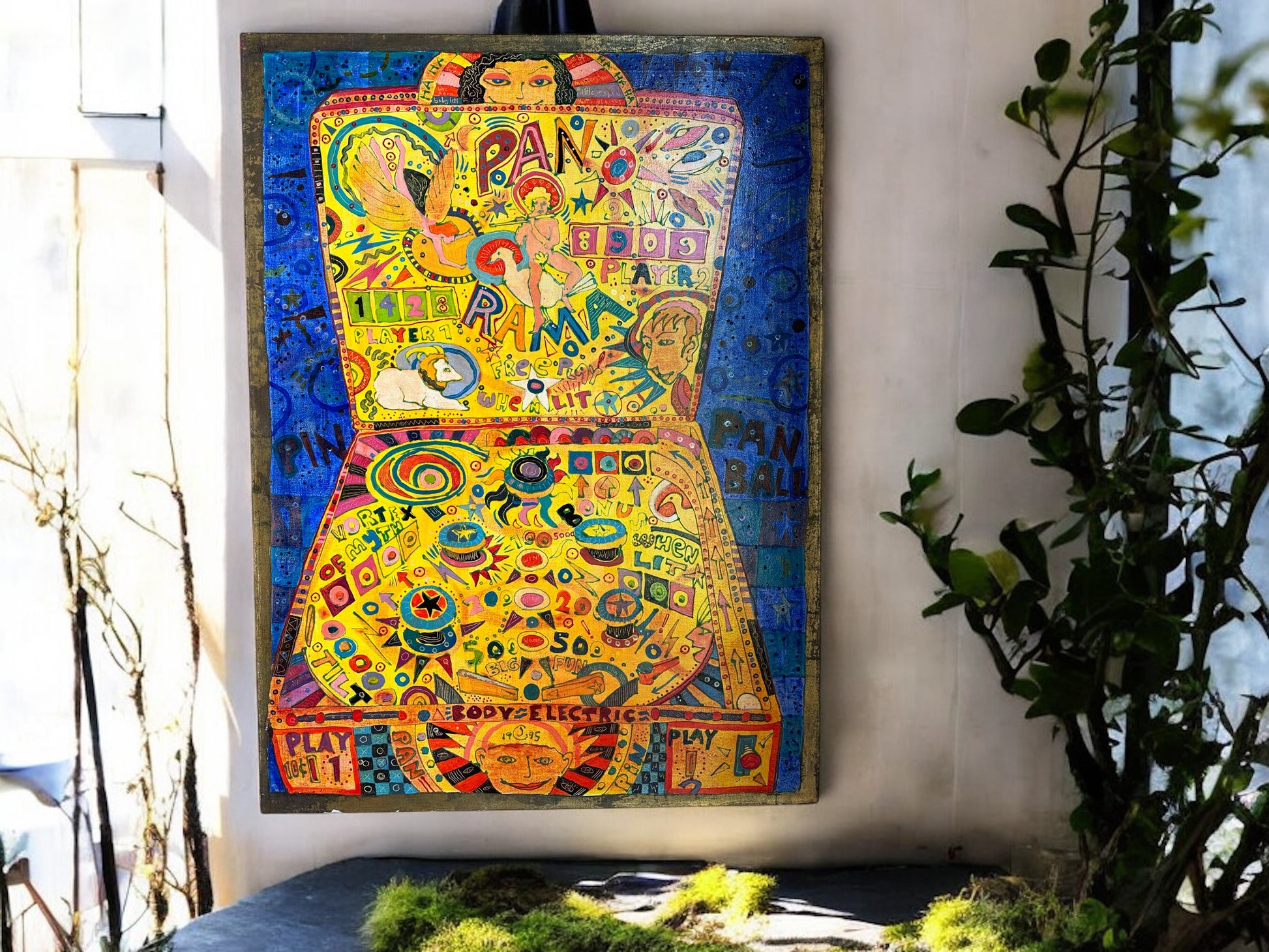 "Add a touch of vintage charm to your space with the Pinball Machine - Jane Gilday - #1195. This mixed media on canvas art piece, measuring 34 x 46", features stunning gold leaf accents. Perfect for any art collector or retro enthusiast."